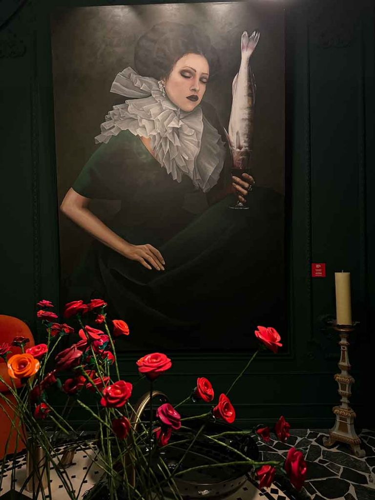 ¡Parece que nos recibe la marquesa en su casa! ¡Con este cuadro tan original de la marquesa con la lubina en la copa de vino!