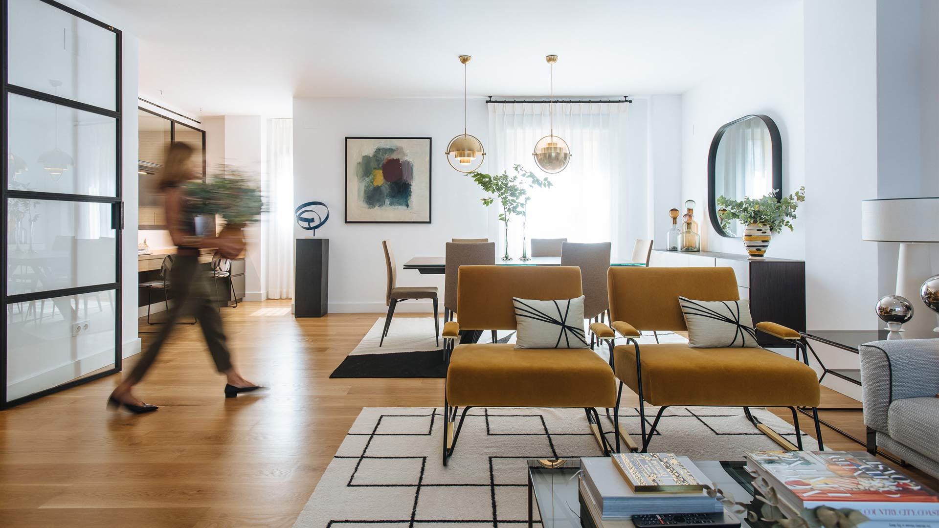 En el salón partimos de un sofá de Roche Bobois en chaise longue al que le añadimos para completar el ambiente dos butacas de Duistt tapizadas en terciopelo mostaza, alfombra kilim de Kilombo Rugs, mesa baja en metal y vidrio de Roche Bobois, lampara de cerámica blanca, cuadros de línea lateral que al quedar descuadrados se hizo una composición con las esculturas de erizos, siempre antes una dificultad se encuentra una oportunidad para agudizar el ingenio!