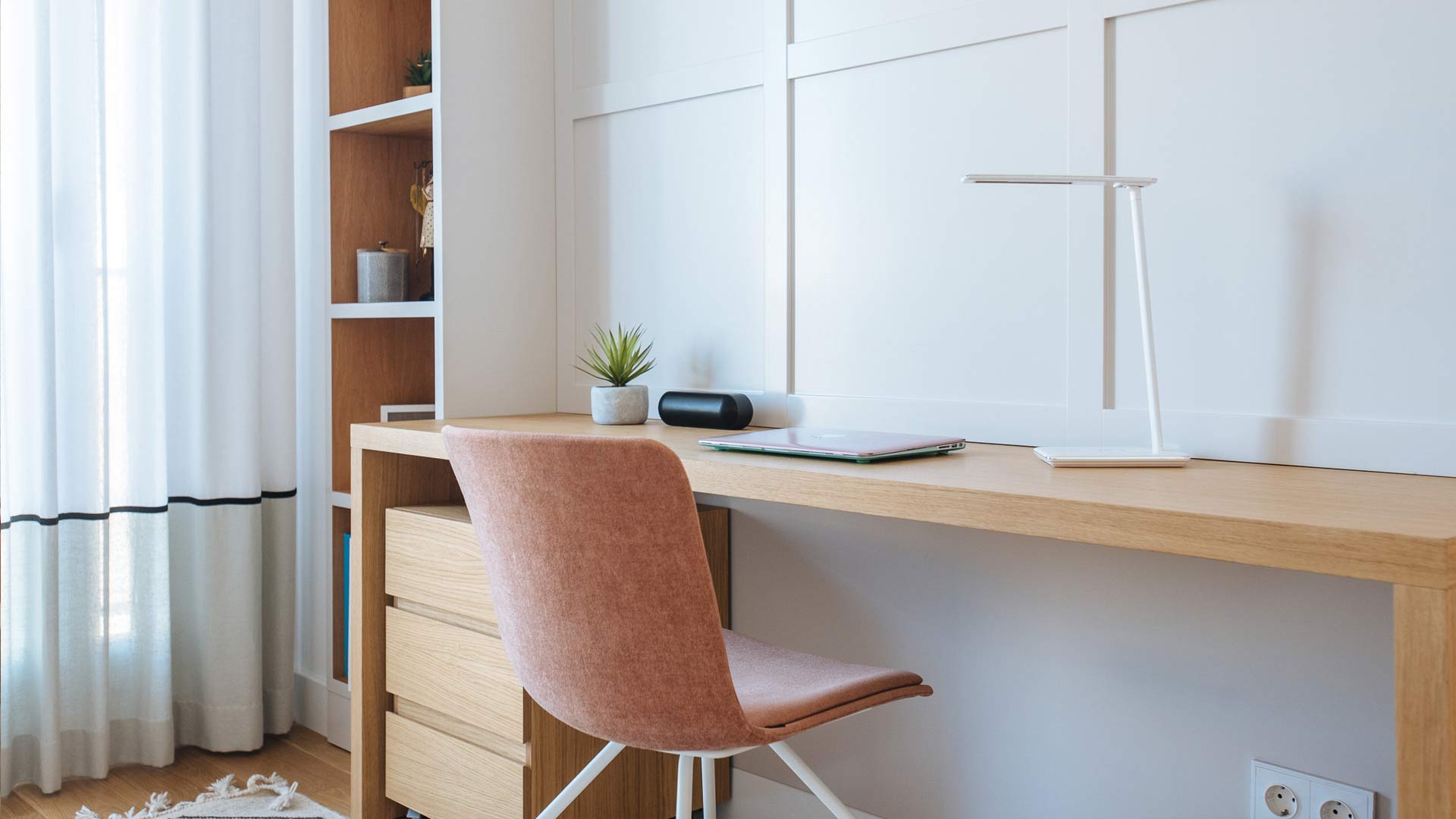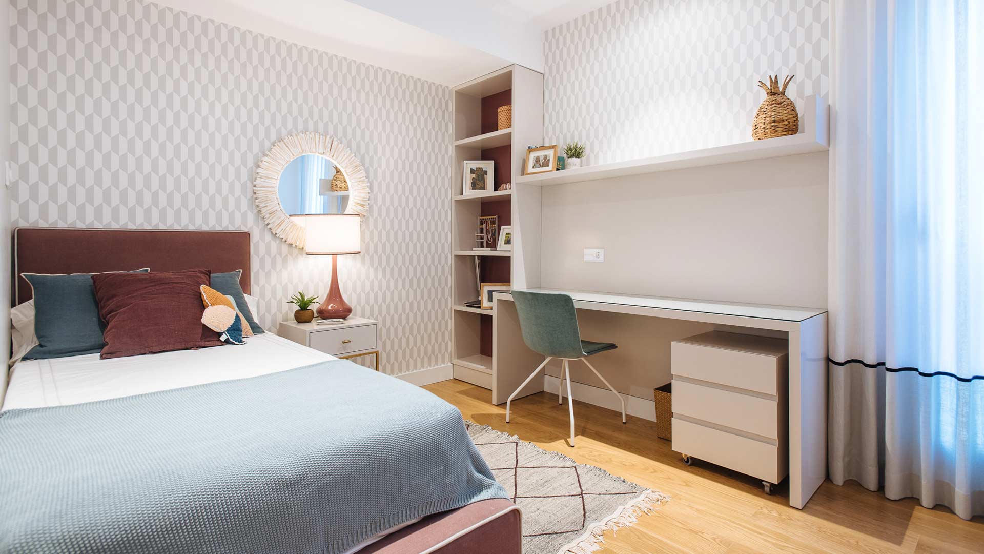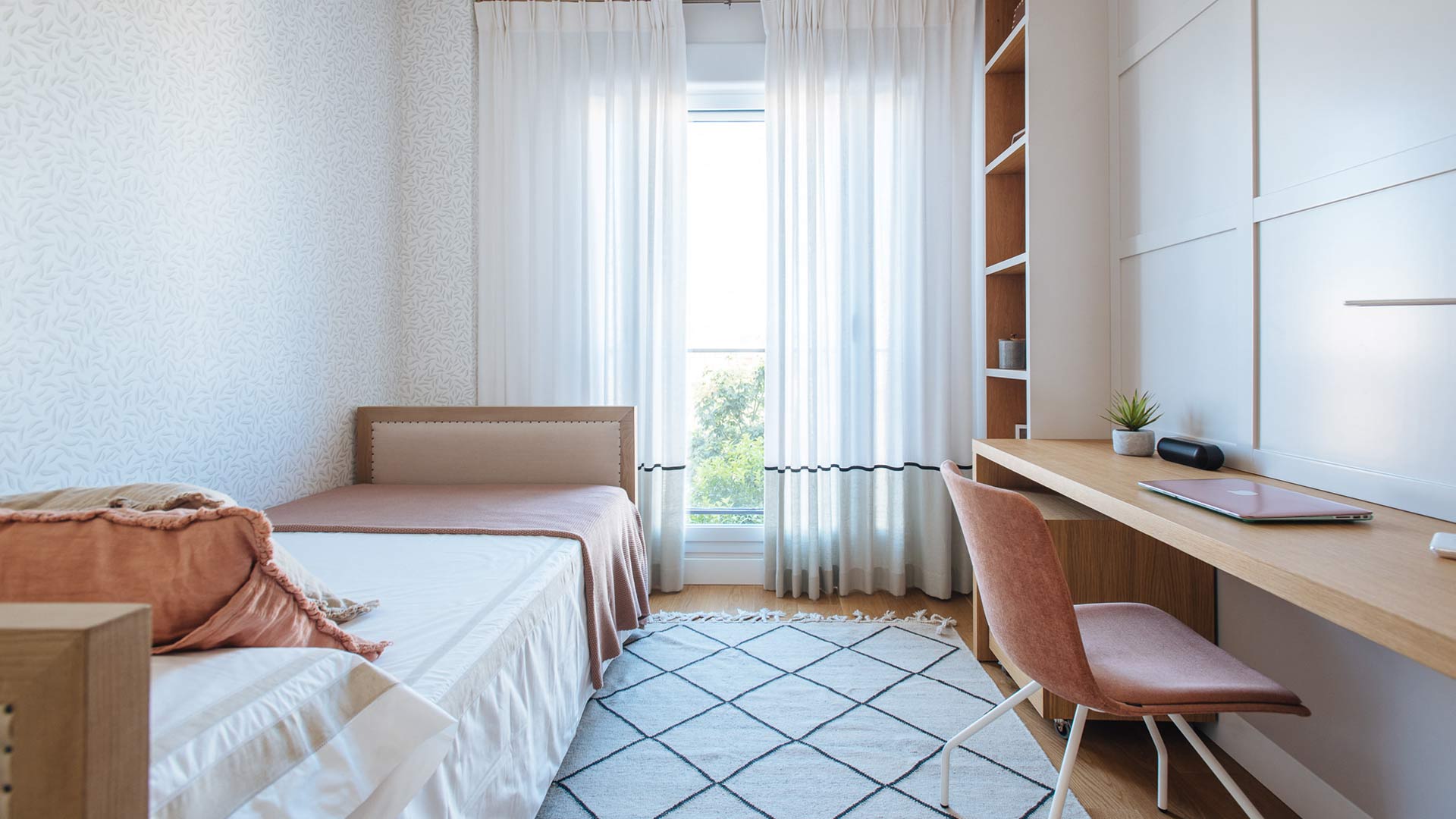 Para el dormitorio de Natalia, se seleccionó un ambiente más inglés, con un papel de Sandberg de hojas en tonos gris y blanco, una cama tipo diván realizada a medida en madera de roble y tapizada en lino natural, cojines y plaid de zara Home, escritorio con estantería diseñados en el estudio lacados en tono piedra que para el trabajo es un tono relajado, con panelado en pared en cuarterones al tono. La cortina de lino con zócalo y línea en terciopelo negro.
