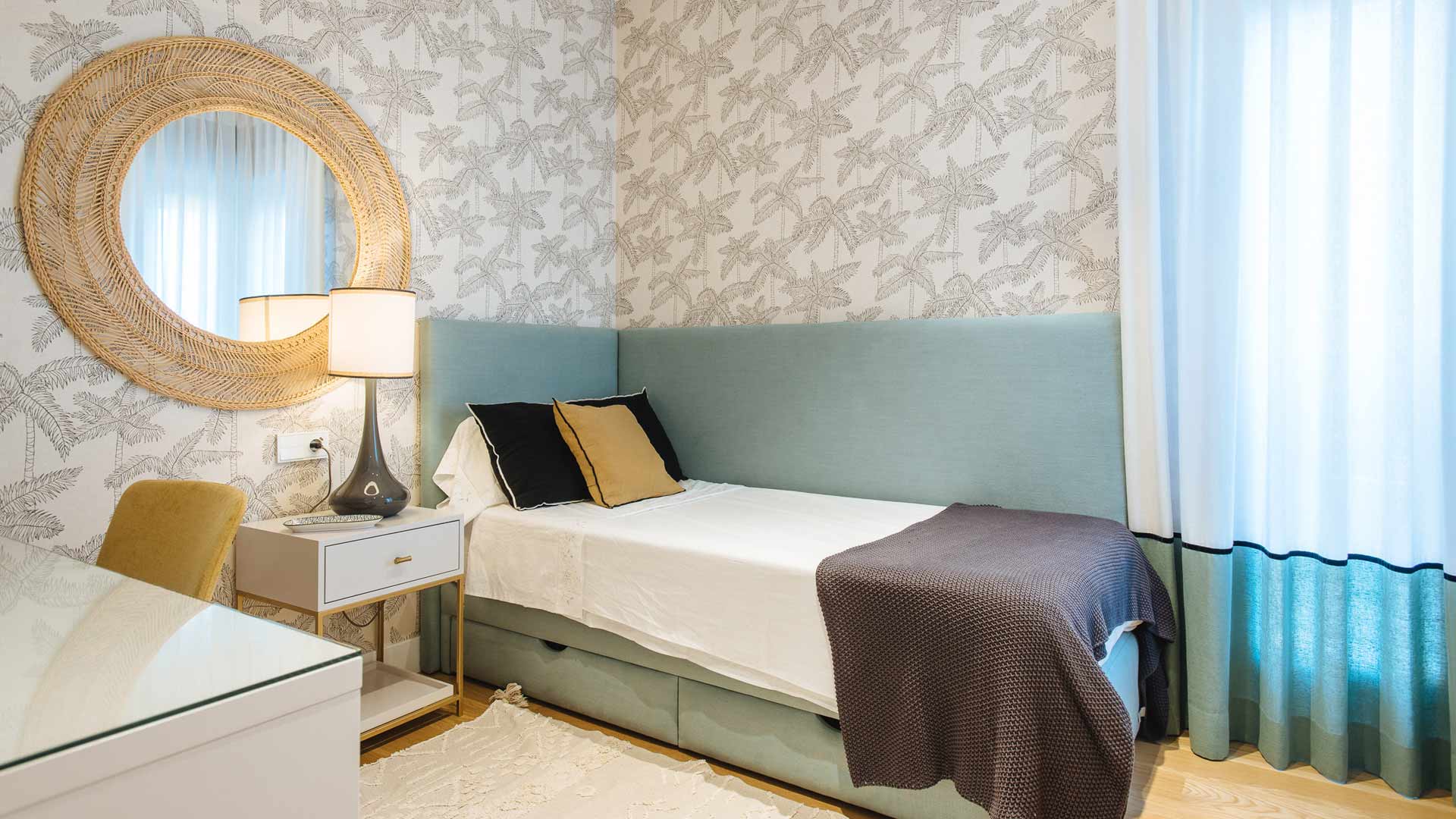Las cortinas de lino con zócalo al tono son el factor común en los dormitorios de las niñas.Para el de Fabiola, El protagonista era el papel de palmeras en blanco y negro eiffinger con espejo de rafia, y cama con cabecero en esquina tapizado en lino Ze con Zeta en color aguamarina, cojines y plaid de Zara Home.