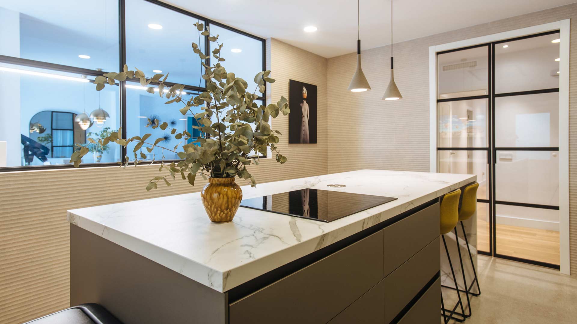 La cocina funcional y bien comunicada visualmente con el salón pero aislada es un espacio bien resuelto que la propia clienta diseñó, tenía las ideas claras! Revestimiento porcelánico de Porcelanosa. Fotografía en Yellow korner.