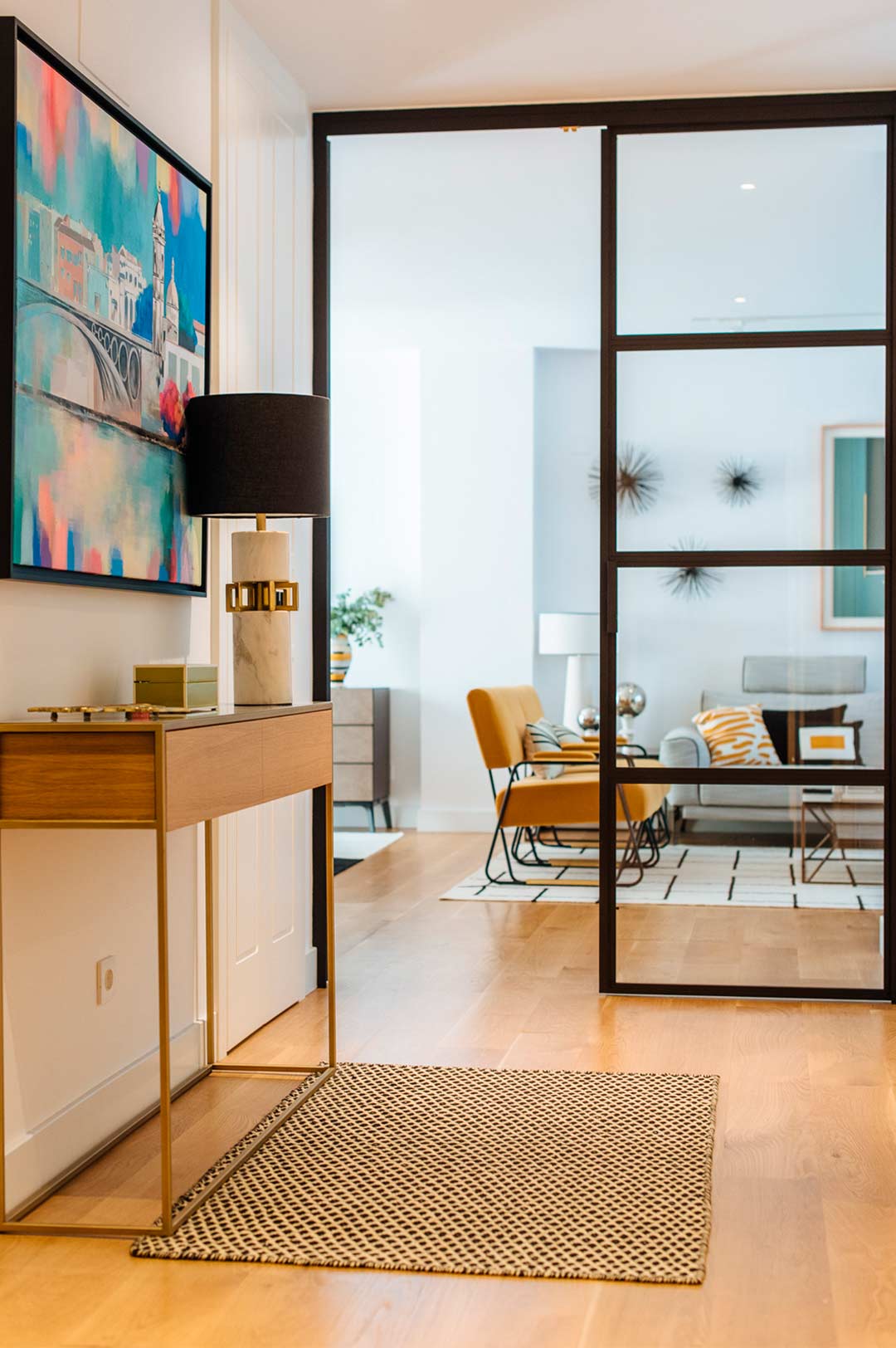 Para el recibidor de Casa Barrau recuperamos un cuadro de Nuria Postigo que traía la clienta de su anterior casa con un nuevo enmarcado y en torno a el diseñamos una consola ligera lacada en alto brillo y con cajones en roble.