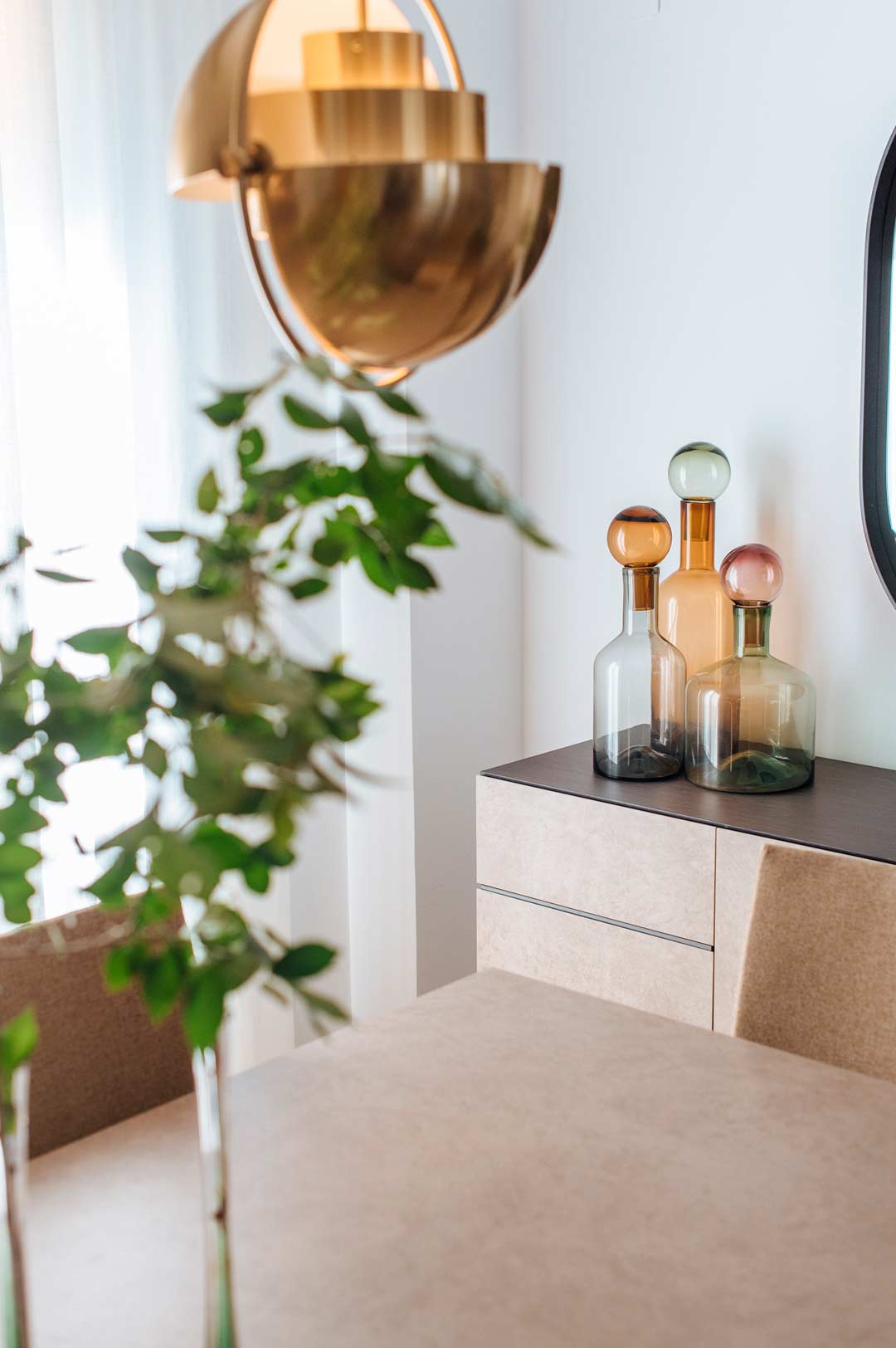 En la zona de comedor, mesa, sillas y aparador de Roche Bobois, lámparas de techo de Gubi, nunca fallan.. un buen espejo realizado en el estudio que nos da profundidad a la estancia, un cuadro de Inés Salinas y peana con escultura de metal que nos complementa la obra, todo sobre un kilim de Kilombo Rugs.