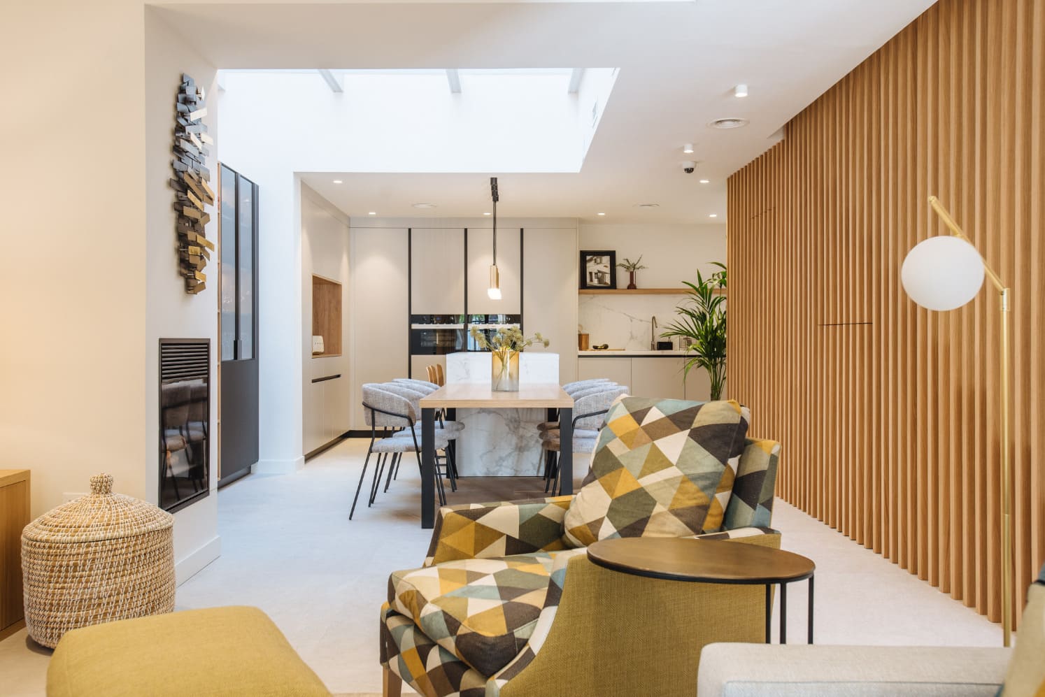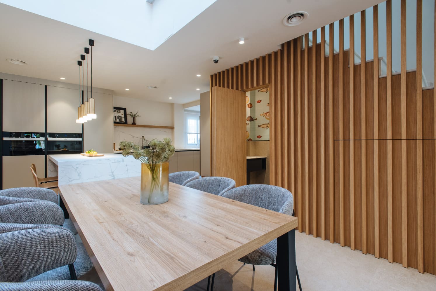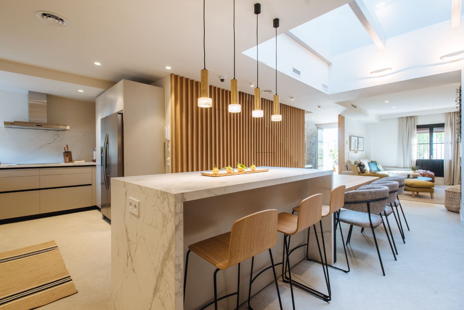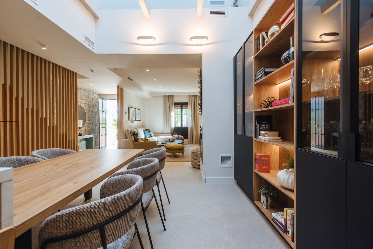 El proyecto Casa Osuna es el resultado del encargo de una redistribución total de planta baja, los propietarios habían estado valorando la posibilidad de mudarse a otra vivienda o darle la vuelta total a la suya ya que no reunía los requisitos actuales de la familia, una vez tomaron la decisión de quedarse en la vivienda actual realizamos un proyecto de renovación total, tanto a nivel distribución de espacios como a nivel estético y funcional. Los objetivos estaban claros, una casa actual, que invitara a disfrutar de todos los espacios en familia.